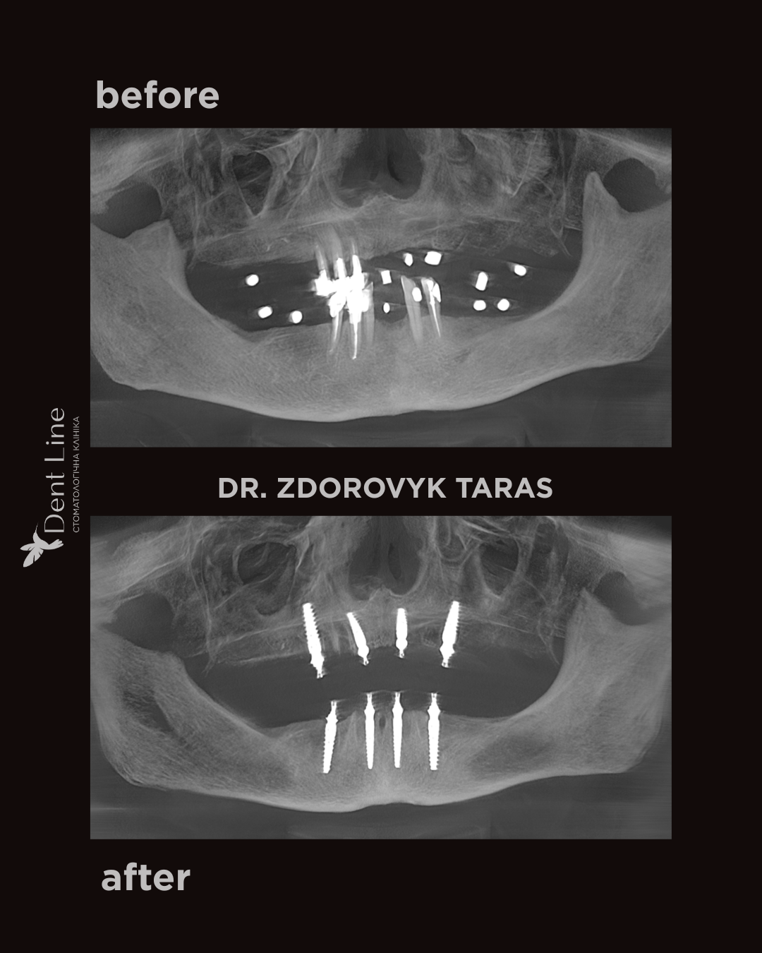 Було проведено імплантацію за методикою All-on-4 — встановлення імплантів JDental на верхній та нижній щелепі з негайним навантаженням. Операцію виконано в один день. У день втручання пацієнтка отримала тимчасові ортопедичні конструкції, що дозволило одразу відновити естетику посмішки та функцію жування.