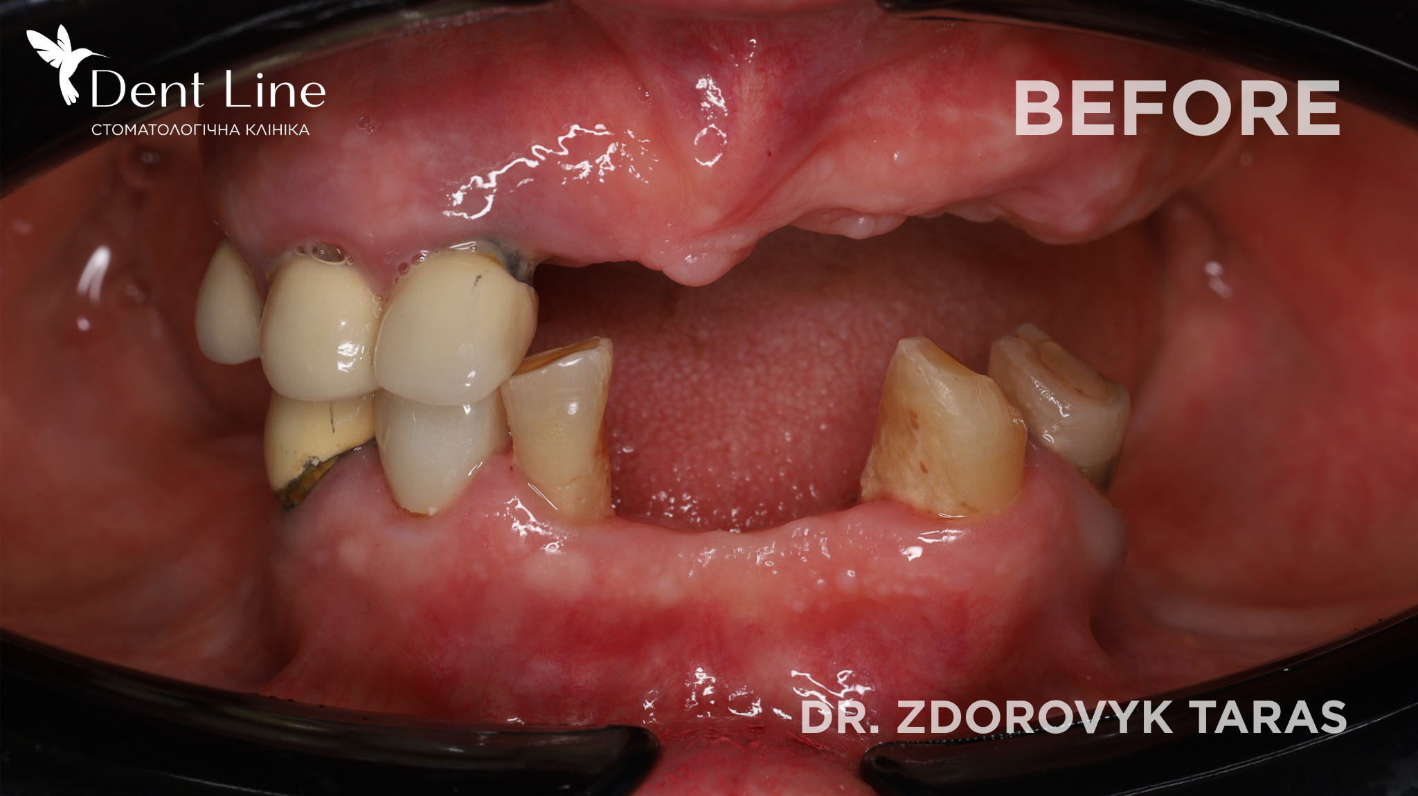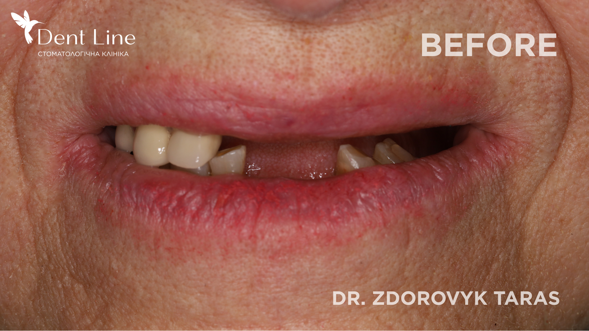 Пацієнтка звернулась до нас зі скаргами на втрату зубів внаслідок карієсу та його ускладнень, неможливість повноцінно пережовувати їжу та виражений естетичний дефект.