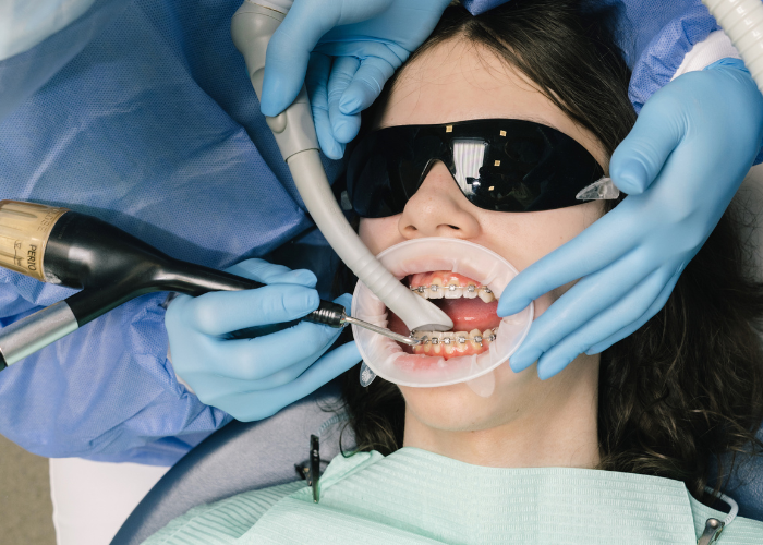 - Подготовка системы: для обеспечения полного доступа ко всем поверхностям зубов и межзубным промежуткам врач временно снимает дуги и лигатуры (резинки). Это позволяет оценить состояние эмали, особенно в зонах под брекетами, которые склонны к риску деминерализации.